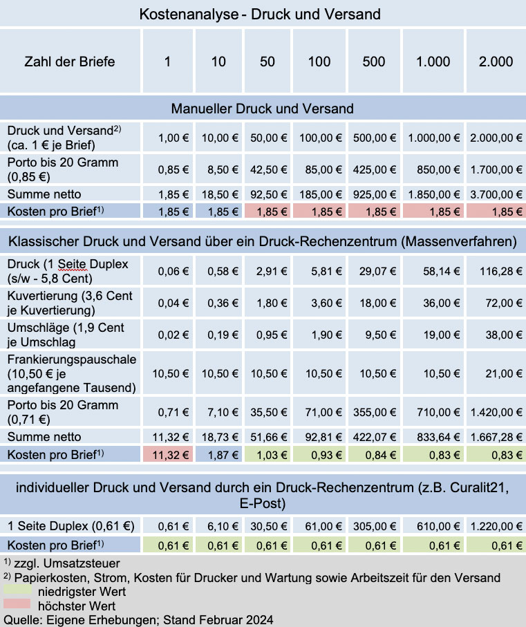 - Beim Versand im Massenverfahren sind bereits ab etwa zehn Briefen die Kosten geringer als beim manuellen Druck und Versand im Rathaus. Ab 500 Briefen spart man so pro Brief etwa 1 Euro.